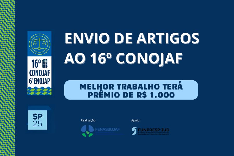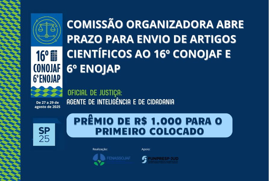 A Comissão Organizadora abre, a partir desta quinta-feira (12), o prazo para recebimento de artigos científicos ao 16º Congresso Nacional dos Oficiais de Justiça Avaliadores Federais (CONOJAF) e 6º Encontro dos Oficiais Aposentados (ENOJAP), que acontecem de 27 a 29 de agosto, no Hotel Pestana, em São Paulo (SP).