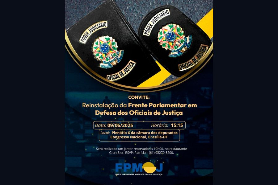 A Câmara dos Deputados realiza, na próxima segunda-feira (09), sessão de reinstalação da Frente Parlamentar Mista em Defesa dos Oficiais de Justiça. A cerimônia está marcada para às 15h15, no Plenário 6 da Câmara, em Brasília.