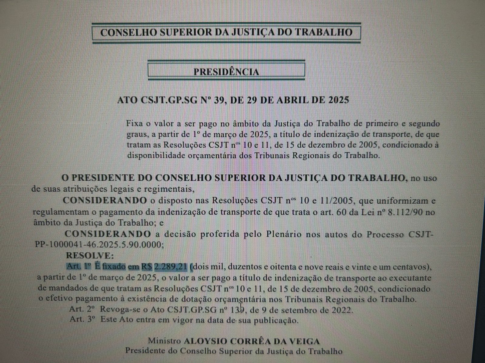 O presidente do Conselho Superior da Justiça do Trabalho, ministro Aloysio Corrêa da Veiga, publicou o Ato CSJT.GP.SG nº 39, de 29 de abril de 2025, que reajusta o valor da Indenização de Transporte paga aos Oficiais da Justiça do Trabalho.