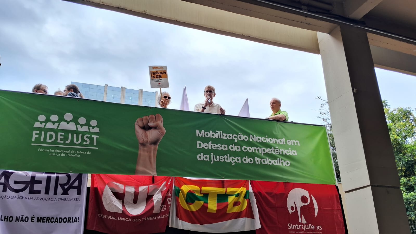 Na quarta‑feira, o pátio do TRT-4 foi palco da mobilização em defesa da Justiça do Trabalho. Como representante da Fenassojaf, o advogado Eduardo Virtuoso discursou contra as iniciativas de enfraquecimento da JT, tais como campanhas de desinformação veiculadas pela grande imprensa, o estrangulamento orçamentário promovido por parlamentares e os impactos negativos da reforma trabalhista de 2017 na Consolidação das Leis do Trabalho (CLT).