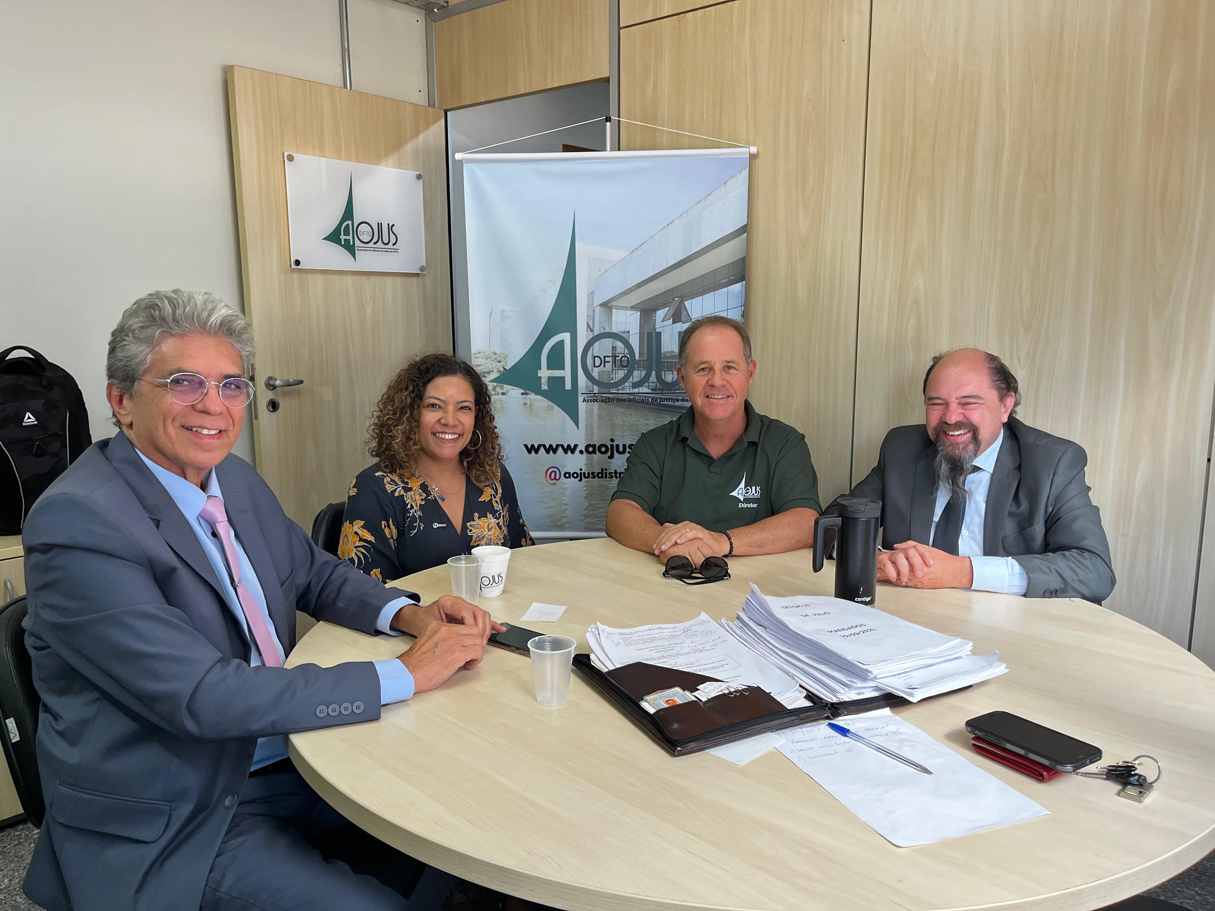 Em seguida, os representantes da Fenassojaf e da Aojus-DFTO participaram de uma reunião na Coordenadoria de Administração de Mandados (COAMA) do TJDFT, conduzida pela coordenadora Adriana Machado. No encontro, foram debatidos temas fundamentais como a recomposição do quadro de Oficiais de Justiça, questões de segurança no exercício da função e os projetos de lei em tramitação no Congresso Nacional que tratam do tema.