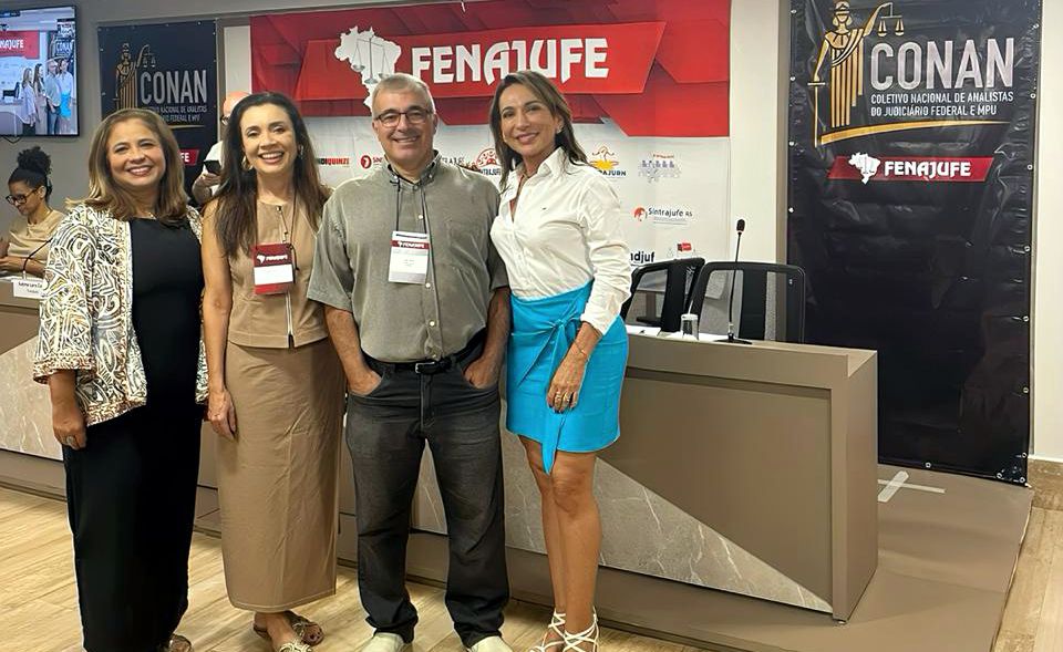 As Oficialas de Justiça Fabiana Cherubini (Fenassojaf/Assojaf-RS), Eusa Braga (Assojaf-AM), Kelma Lara (Assojaf-CE), Juliana Rick (Assojaf-MG), Márcia Pissurno (Sindjufe-MS) e o Oficial Samir Bittar (Assojaf-15) participaram do Encontro Nacional de Servidores e Servidoras Analistas do PJU e MPU (CONAN), realizado no último sábado (04) e domingo (05), em Brasília.
